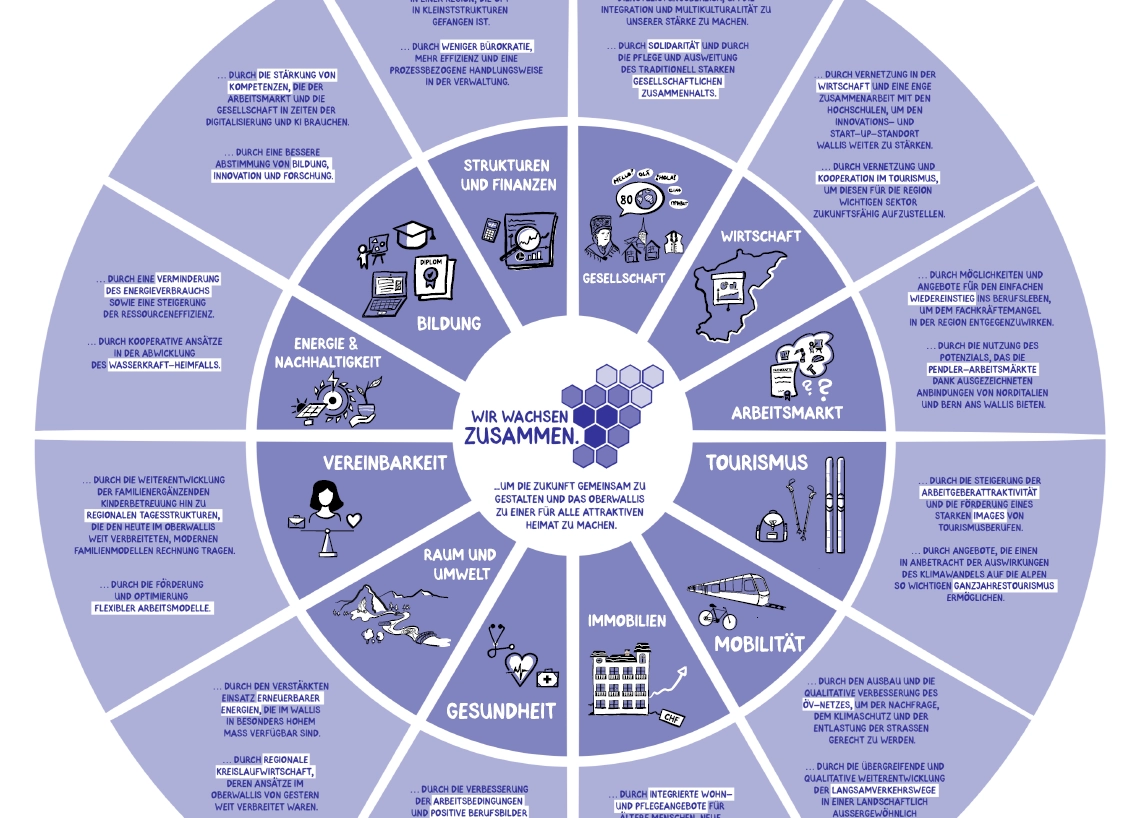 Der Prozess zur Erarbeitung des Zukunftsbilds wurde so gestaltet, dass die Bevölkerung möglichst stark eingebunden werden konnte. Als Resultat liegt nun eine breit abgestützte Vision für das Oberwallis vor: Die Bevölkerung möchte Zusammenarbeit, Solidarität und Gemeinschaft. Entsprechend wünschen sie sich eine positive Entwicklung der Bergdörfer ebenso wie mehr Zusammenarbeit über Branchen und Sprachgrenzen hinweg. Gleichzeitig möchte die Bevölkerung ein offenes, modernes Oberwallis und setzt dabei auf flexiblere Arbeitsmodelle, auf Innovation, Energieautarkie und neue Konzepte im Bereich Mobilität und Wohnen.